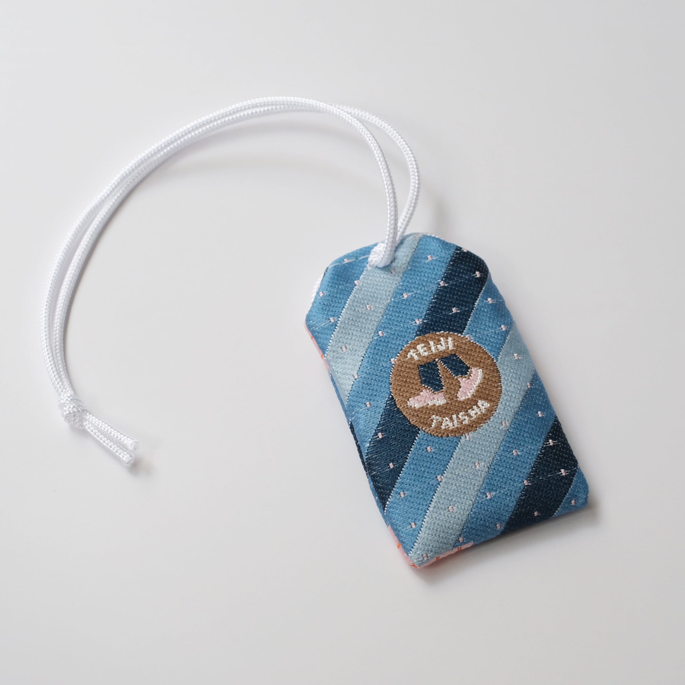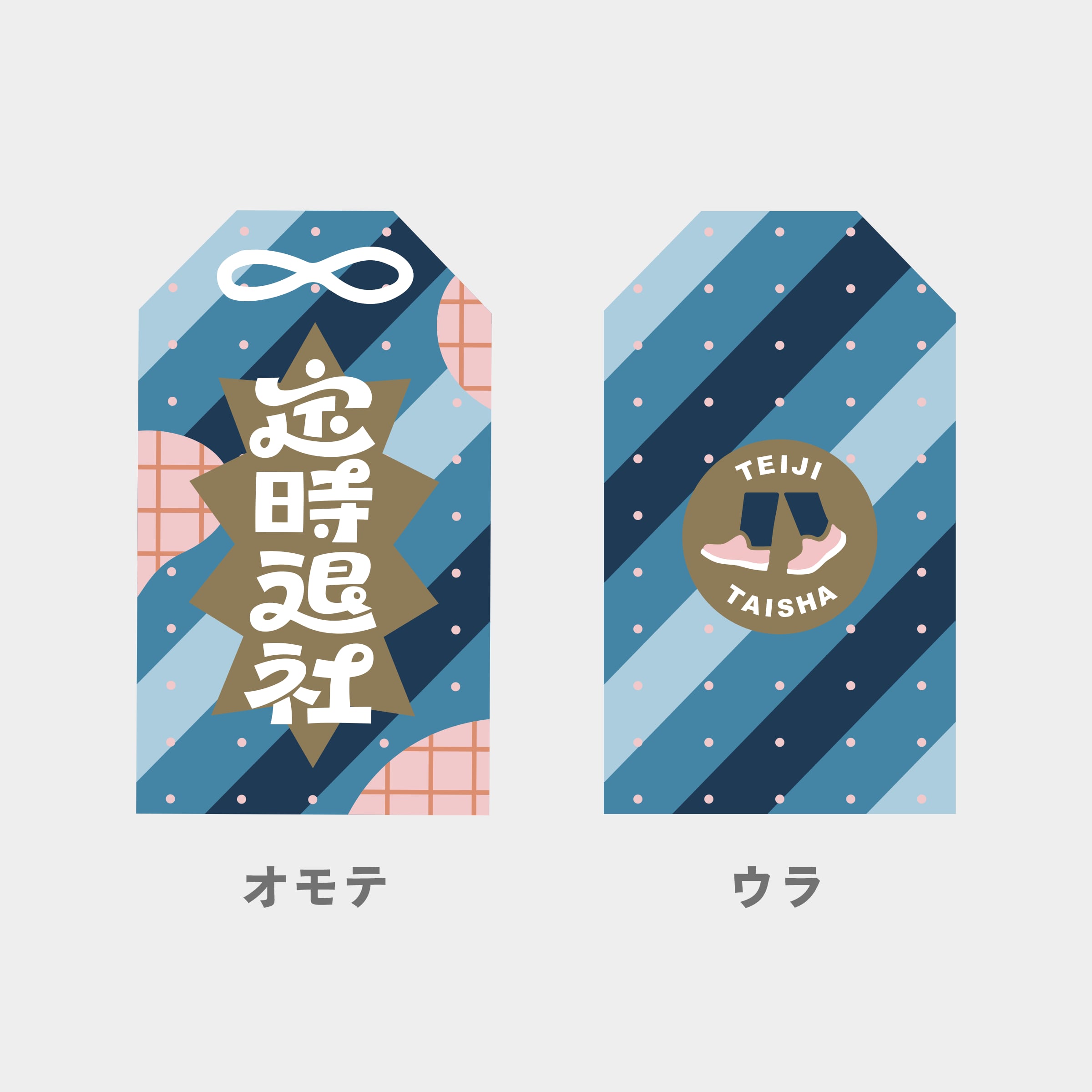 「定時退社」の文字をあしらったお守り袋。